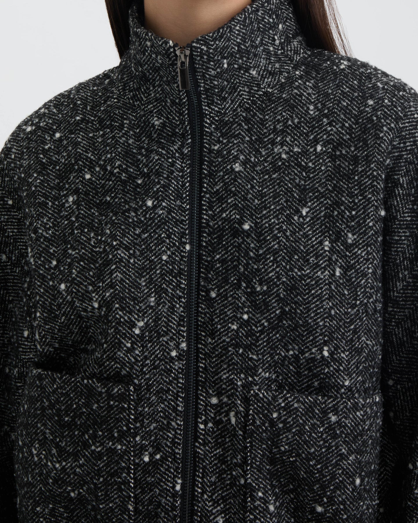 This dolman jacket features a stand collar and full front zipper for easy layering. Crafted from textured boucle woven fabric, this jacket features patch pockets and adjustable bungee drawcords at the hem and cuffs for a customizable fit.
